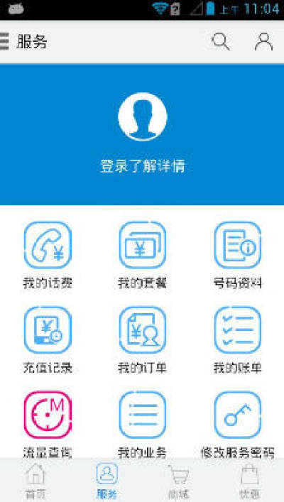 1、我的移动:我的话费,流量管家,我的积分,套 餐使用情况,已办业务,服务密码,营业厅查询,短号查询/设置;