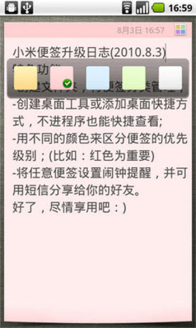 1.可将便签内容用短信及邮件方式分享给你的好友。