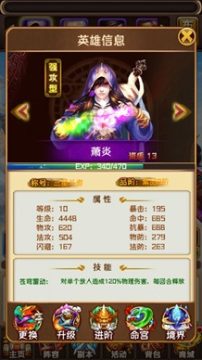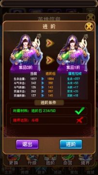 进阶:一个大大,牛掰掰的功能,进阶只要进阶条件达到的情况下,点击进阶100%的成功。成功后可提升大大的属性加成及英雄阶级。(使用后,再也不缺妹子了)