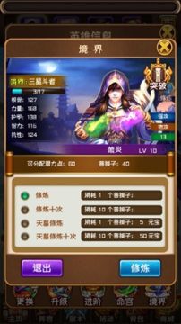 境界: 境界分为“突破”“修炼”两个功能。突破(第一张图)有4项可供进行选择,并可提升“根骨”“力量“护甲“智力”“抗性”属性。修炼可有效的提升斗者境界,从而完成自己成为斗帝的道路。(当然这还需要游戏中其他的奋斗路程来作为协助喔)