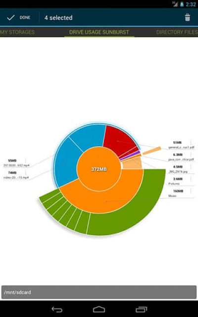 中心周围的扇形图表表示您当前的目录,它们通过一个圆形图标被展示。其余部分是子文件夹以及文件,您可以点击扇形部分并深入了解,应用将会绘制您先前所选定的扇形部分并层层展示。