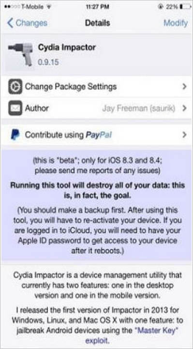Cydia Impactor的好处显而易见,不仅大大节省了用户的宝贵时间,同时还能保持现有的iOS系统版本以便日后再次越狱。需要使用的iOS用户可以在Cydia中搜索下载,Cydia Impactor最新版本号为0.9.15,目前仍处于beta测试阶段,仅支持iOS 8.3和iOS 8.4。