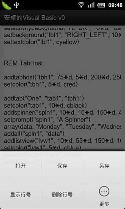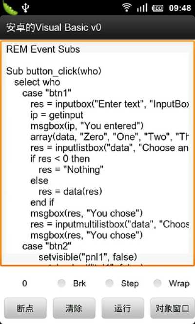 安卓上的Visual Basic,可在手机上编写BASIC语言程序并运行!语法基本和Basic一模一样。详细语法请在运行程序时,打开“菜单”——“更多”——“查看示例”。有所有对象的详细使用方法。运行该示例更加直观。