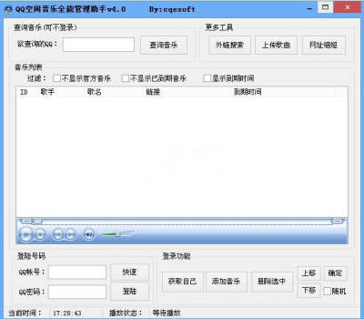 qq空间的背景音乐全部的功能一般都需要开通QQ绿钻功能才行,那么普通用户怎么样才能管理好自己的QQ空间音乐呢?奇Q吧QQ空间音乐全能管理助手是一款功能强大,方便易用的qq空间音乐管理软件。该软件是奇Q吧推出,软件自动检测更新,有更新自动更新,让用户轻松享受QQ空间音乐。