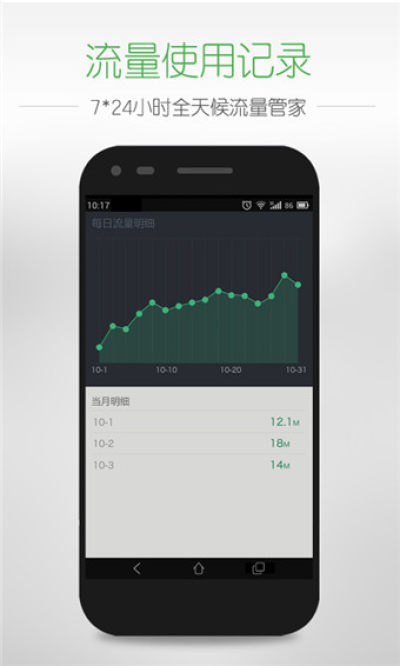 1、智能流量统计,月剩余流量、今日已用流量、本月已用流量,实时监控每天流量数据,让你不再为流量超额担心;