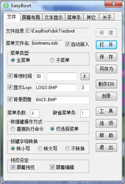 EasyBoot是一款非常好用的集成化的启动光盘制作工具,中文软件,操作简单,可以制作光盘启动菜单、自动生成启动文件、并生成可启动ISO文件。只要通过CD-R/W刻录软件即可制作完全属于自己的启动光盘。