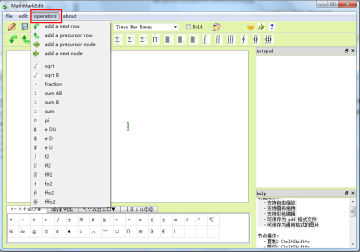 MathMarkEdit支持多种运算符,相信在以后的版本中会加入更多的运算符。在功能上没有MathType强大,它只能做一些简单的公式编辑,使用比较容易,用鼠标选择要添加的数学公式即可,可以将编辑后的文档保存为图片(png/bmp/tiff/jpg),也可以保存为pdf或者xps文件。