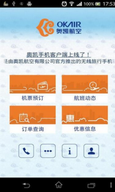 这是奥凯航空的手机客户端,帮助用户提供票价查询和在线预订等特色功能,让大家的旅程变得更加的轻松畅快,遨游世界!