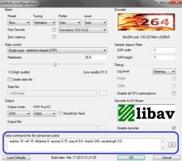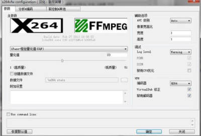 从界面上可看出x264有的东西x264vfw基本全有,Preset的medium、slow、slower、very slow、placebo等,Tuning的Animation、Film、grain等,Profile,Level,Rate Control的CRF质量模式、2pass指定码率,应有尽有,用过小丸工具箱的人可能对这些参数不会陌生。最关键的是注意下方的命令栏,x264vfw自带附加命令栏,诸位大可把自己在MEGUI或小丸里自定义的复杂参数甩过来直接用于渲染。若对参数、指令不大了解,附加命令栏右边的问号按钮中有英文版的全部解释,可以对照着使用