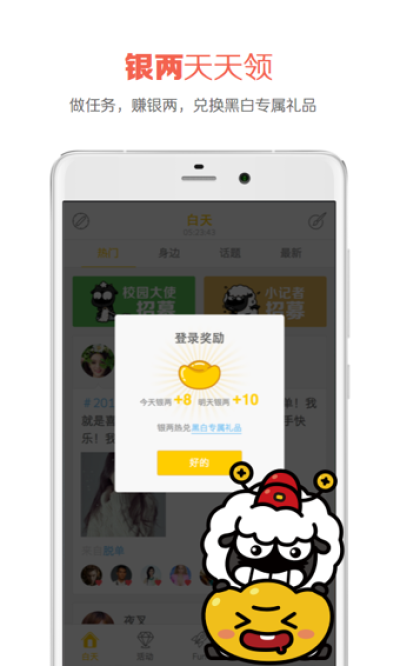 为什么是晚上九点?黑白校园玩得是创新的“分时社交”概念,原因很简单:学生白天在教室上课,晚上在宿舍卧谈,前者理性,后者感性。每天早上7点到晚上9点,黑白校园处于白天模式,用户的昵称,发帖,点赞,评论,一切正常。