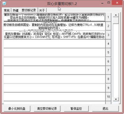 双心多重剪切板是一个windows下增强版的剪切板软件,能让你把多次复制到剪切板的内容合并后正反向粘贴,粘贴时可以加入回车或者tab键作为间隔。