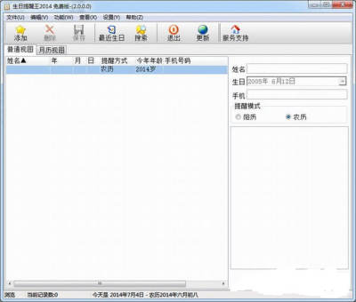 如果某一天你的女朋友突然不开心了,那么很可能就是你错过她的生日了,为了避免这样的悲剧发生,小编建议大家使用生日提醒王这款实用性极强的提醒工具。支持阳历(公历),阴历(农历)生日提前提醒。每次仅在开机时候进行检测一次(几乎不影响计算机开机速度),不会常驻运行占用计算机资源。可指定提前多少天进行提醒,支持无数个生日。生日记录可以保存为单个文件,从文件中导入;亦可使用邮件发送跟亲友分享。 推荐公司人事部门使用来提醒员工,或者客户生日,当然家用也很合适。