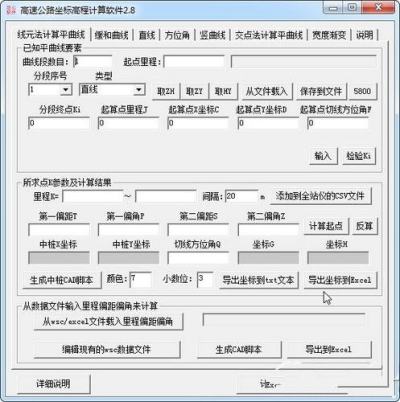 计算方法根据曲线是否完整对称可以选择交点法计算和特殊点计算方法。生成的坐标成果可以直接通过数据线导入全站仪,也可以导入Excel中便于打印,导入AUTOCAD中生成DWG图形,根据线形是否平顺来检验坐标准确性。是施工放样和图纸坐标高程复核的好帮手,还可以用来复核工程上广泛应用的可编程计算器CASIO 5800坐标高程避免出错。