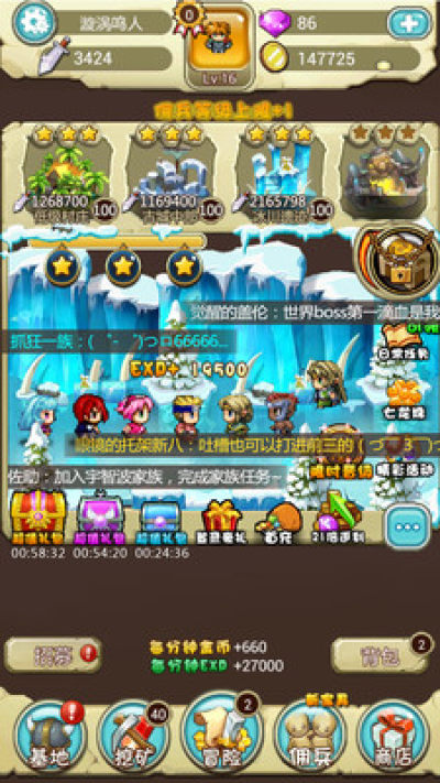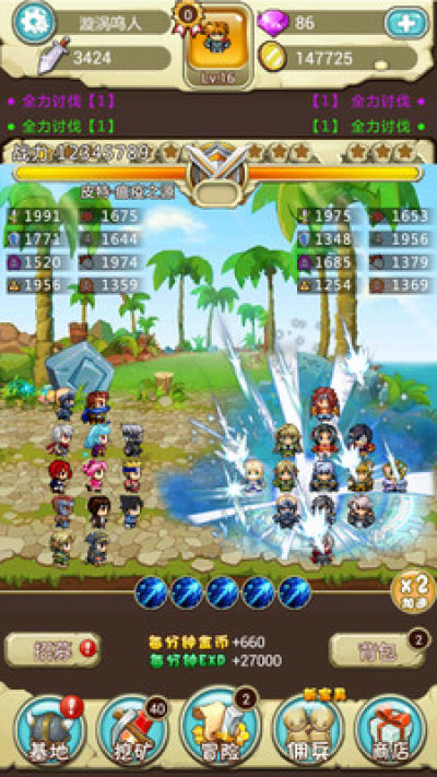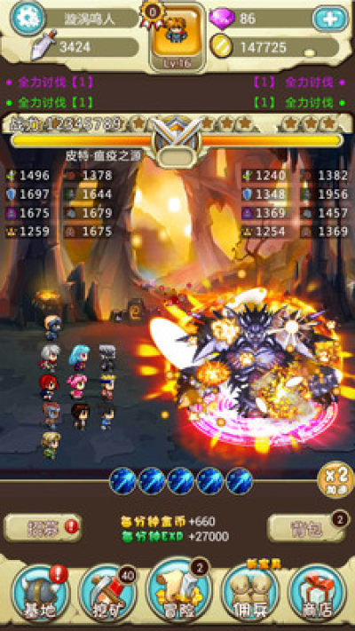 本作是一款创意玩法的挂机手游游戏玩法非常轻松休闲,其中的人物从动漫到游戏,各种主题都有,全部是小人的卡通形象,玩家们可以派遣这些不同的小人去进行挖矿打造神器,然后挑战各种强大的邪恶boss。