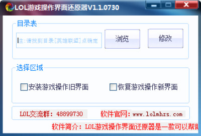 lol游戏操作界面还原器是一款最新研发的英雄联盟操作界面修改工具,软件能轻松的将如今的游戏操作界面还原到未更新游戏操作界面之前,方便玩家更轻松熟练的操作游戏。大家都知道英雄联盟在官方7月28号正式对游戏界面进行了大更新,许多的玩家都不大习惯这游戏界面,而通过软件即可直接还原到大更新之前,祝大家游戏的开心。