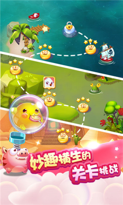 这款萌系泡泡龙玩法手游,无处不在的充满着欢乐,游戏以经典的泡泡龙消除玩法,搭配可爱轻松的音乐曲调,给玩家带来最为休闲的消除手游体验,本作从界面到关卡设计,都围绕着萌主题设计,非常不错。