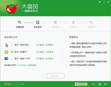 2.选中要备份的内容,点击”备份“按钮,大番茄会自动将文件备份到选中的目录下,备份完毕后点击“下一步”。