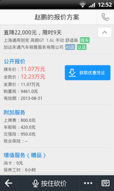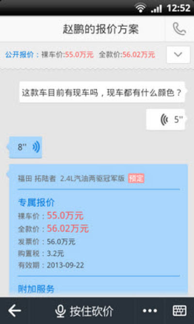 4.语音砍价:向当地汽车4S店销售顾问匿名发起砍价,语音、文字沟通随心所欲;