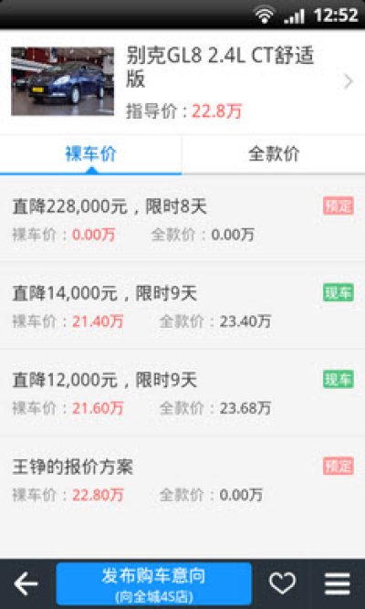 3.底价购车:一对一砍价太麻烦?发布您的心理购车价格,全城汽车4S店为您提供购车报价方案;