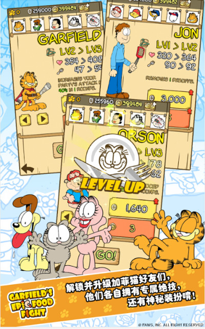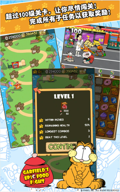 本作是一款以加菲猫主题进行设计的休闲三消rpg手游,游戏中加菲猫和他的朋友们进行消除玩法,为了食物不断的闯关,创造消除高分,游戏中还有各种邪恶的外星人等待着加菲猫和他的小伙伴们去击败,这款休闲卡通消除手游非常有趣。