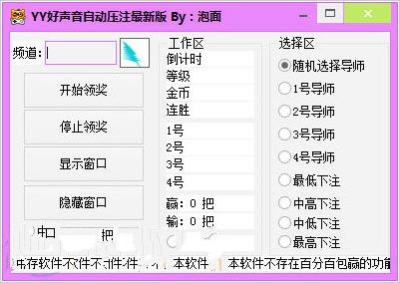 YY作为一款成功的语音聊天软件,能够在QQ手中抢到众多的用户,其丰富的奖励活动具有很大的影响,小编曾经就傻傻的挂机按时领取奖励。不过自从有了YY好声音自动压注是这款适用于YY好声音活动的yy自动领奖软件之后再也不用担心领不到奖励了。该工具支持实时监控活动,帮助你自动领奖,让你的yy金币快速增加!