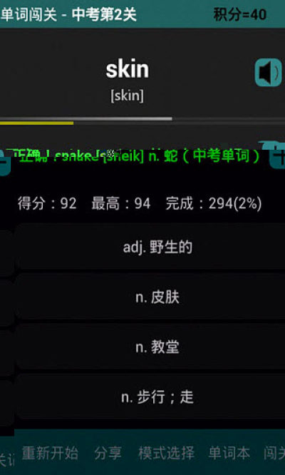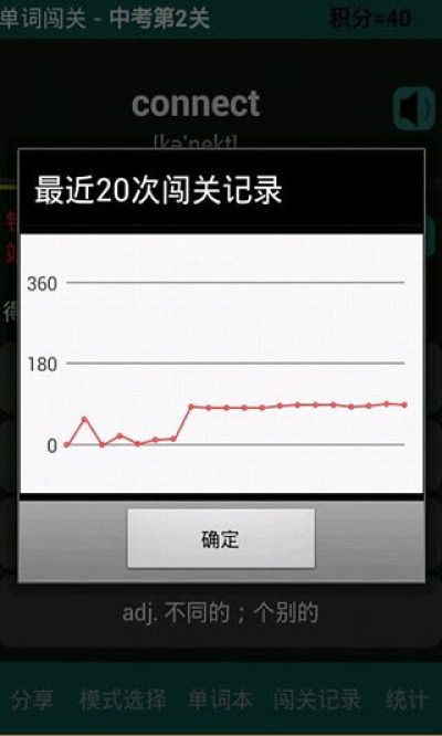 单词闯关是一个让用户在玩游戏的过程中就能背单词的应用。每出现一个新词,有四个答案可供选择,选对了得1分,选错了,扣3分。有小升初,中考,高考,考研,托福等关口,完成所有闯关即游戏结束。在闯关的过程中,可以选择发音模式,以达到练习听力的目的。坚持50天单词闯关,你的单词量就会有明显的提高。同时还可以把你已背单词数和好朋友分享,达到一起背单词的目的。