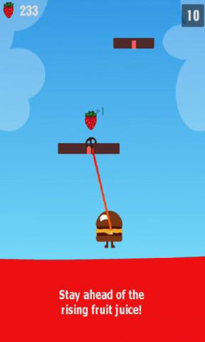 这是一款画面简单,玩法简单但有趣的休闲小游戏,游戏中玩家将控制一个铁钩主角,不断的利用铁钩向上飞跃,注意不要被上升的果汁所淹没了,这款手游趣味性十足,值得一玩。