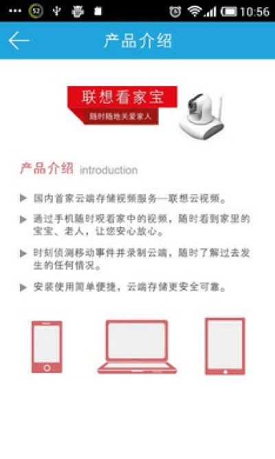 联想云视频客户端是配合联想看家宝使用的手机软件,它可以通过网络连接联想看家宝摄像头,流畅、稳定、安全地查看监控视频,捕捉您关心的事情,获得安心的生活!