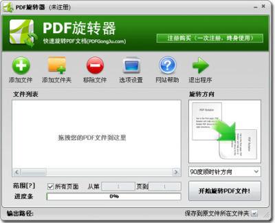 运行程序,添加您的PDF文件到文件列表里,选择一个旋转方向(90度顺时针,90度逆时针,180度),点击“开始旋转PDF文件”按钮即可。