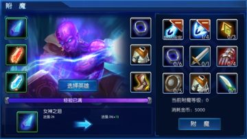 获得绿色即以上品质的装备之后,即可对装备进行附魔提升附加属性。在主场景中点击附魔进入装备附魔界面。选择对应的英雄和装备,添加需要使用的材料即可进行附魔。每次附魔根据添加的材料数获得附魔经验,附魔经验累积满之后就会获得附魔属性加成了。