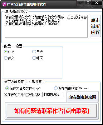 广告配音语音生成制作软件是一款输入文字内容试听,支持多种语言以及文件输入格式的免费文字语音生成工具,可以将文本文字换化成音频mp3格式和视频avi格式的文件,软件采用国际领先的语音合成技术,合成的MP3语音文件播音效果可与专业播音员相媲美,适用于商场、超市、商店、学校、工厂、公司、餐厅、专卖店、银行、车站、码头等公共场合