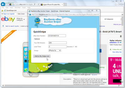 BayGenie eBay Auction Sniper Pro 通过在拍卖结束的最后几秒钟之内投出你的标底的方式狙击 eBay 拍卖。该软件允许你通过其内置的网络浏览器浏览 eBay 拍卖,通过点击一个按钮的方式添加你所感兴趣的拍卖,然后在一个列表当中跟踪你的所有观察,狙击,中标,失去的拍卖。该软件兼容于所有的时区并且支持全球19个 eBay 网站。BayGenie 使得 eBay 投标过程成功且简单。