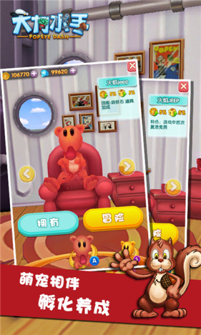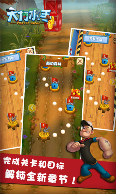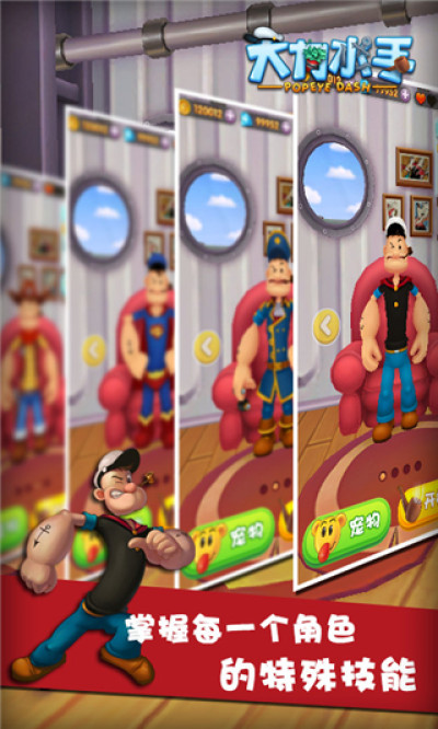玩家将在游戏中扮演大力水手波派,以跑酷形式躲避各种障碍,追逐坏人,解救妻儿!游戏设有大量的精美场景供玩家选择体验,例如轮船、船舱、森林等等,丰富的游戏内容让游戏更加具有可玩性,更有无尽关卡玩法挑战您的极限。波派更穿上现出不同的时装更可以获得不同的技能,让你的挑战变得有趣轻松,魔法狗Jeep更会祝您一臂之力。还不快来加入大力水手的世界,一起拯救奥利弗吧!
