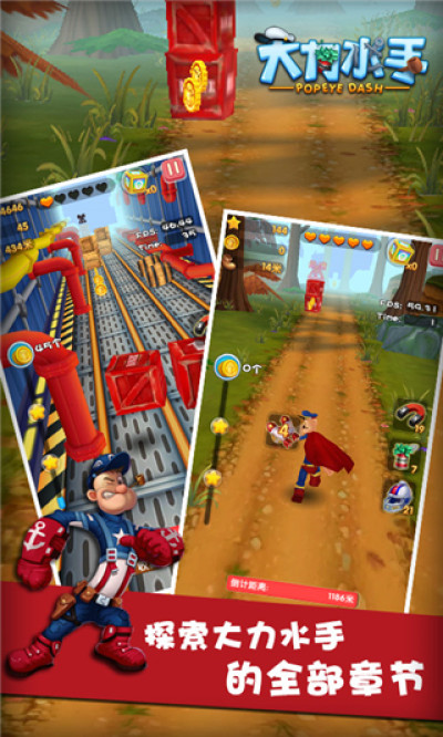 这款竖屏跑酷手游是根据经典的美国动画大力水手改编的,游戏中我们将操作经典的大力水手人物形象,进行竖屏跑酷,沿途中会遇到各种障碍和困难,如果在危机时候还能通过吃菠菜来化解危机。