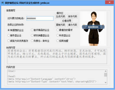 网站代言宝生成软件是一款由圆梦编程论坛为新手网页制作者开发的能够根据企业类型的不同自动生成网站上网站台词代码的免费js代码生成工具,该工具可以生成一段美女讲解一段台词来展示公司的形象,用户可以自行设置公司对外展示电话,选择一段台词,生成代码之后,就可以放到自己的网站上面,当别人一打开你的网站就会出现美女代言人进行会对你设置的内容进行讲述,非常的不错。