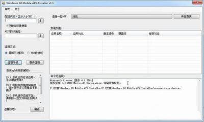 win10 mobile apk installer支持局域网和数据线两种连接模式,支持批量apk部署和安装前文件信息预览。在wind10mobile手机中开启开发者旁加载模式以及设备发现,然后将设备与电脑端进行连接,匹配成功后就可以选择apk应用进行部署了。