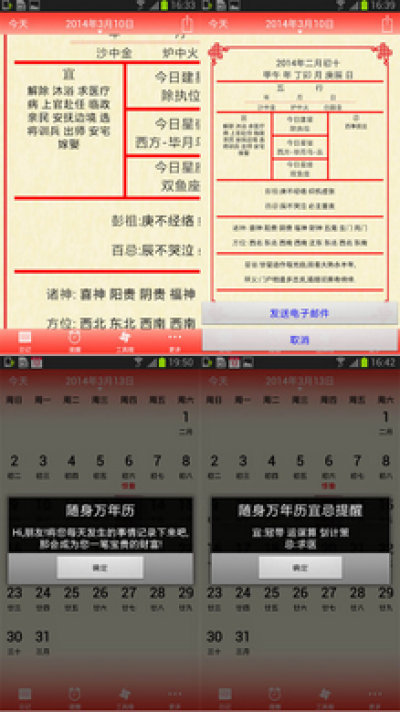 - 支持黄历宜忌通过电子邮件和短信发送.