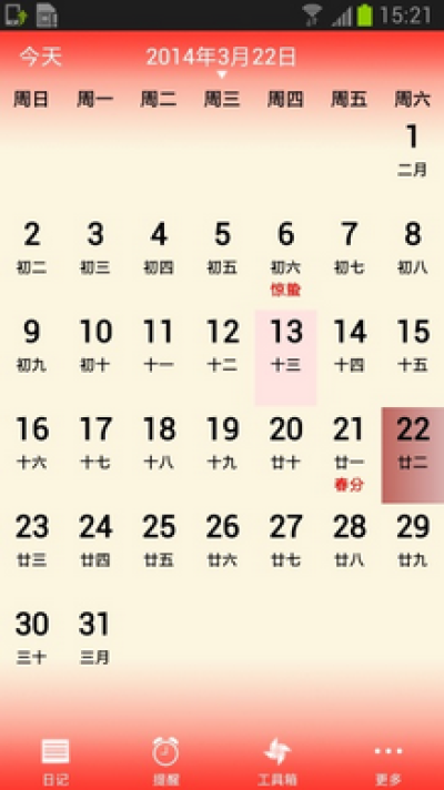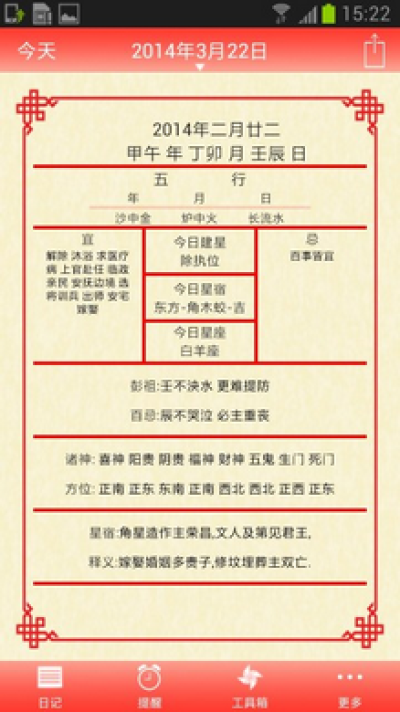 随身万年历是专门为国人设计的一款手机万年历软件,它会自动播报每天的宜忌运势,风水五行让你第一时间知晓,同时支持每天写日记和设置闹钟提醒功能,是大家生活中的必备工具!