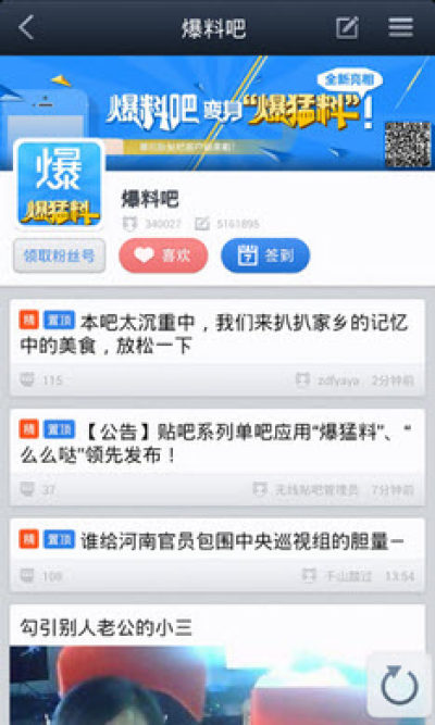 “爆猛料”是百度贴吧单吧版系列应用之一,集合最新一手消息,我伙呆热点猛料,毁三观社会百态,娱乐八卦大小事,想要速度曝光,就来这里爆猛料吧!