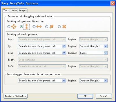 Easy DragToGo,左键任意方向拖曳链接即可在标签页打开,选取某些字符拖曳后将在标签页搜索这些关键词(搜索引擎可以自定义)。