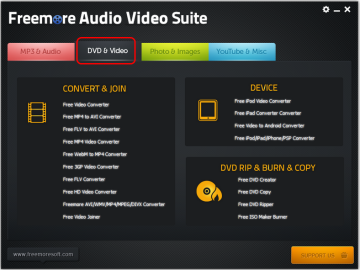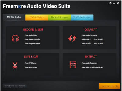 Freemore音频视频套件提供了几乎你可能需要在你多媒体制作任何工具:它可以帮助您视频和音频格式几乎是广大之间转换;录音&增强从不容易;随着铃声软件,您可以创建你音乐收藏铃声;在CD/DVD/ISO工具使音频/视频/ISO刻录和备份容易像一个魅力;