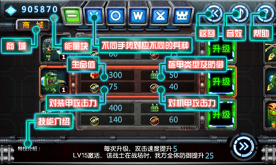 游戏中包括攻击型、防御型、敏捷型、治疗型、血型五大兵种,玩家在游戏中控制机甲城堡,招募各种机甲兵种,通过攻打各个星球,掠夺能量,壮大自己的实力,然后征战四方,夺取更多的星球,招募出更加强大的兵种,最终称霸太阳系!