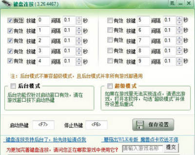 键盘连按5.1版只需勾选后台模式即可启用后台功能,然后在需要后台的游戏窗口中按下启动热键即可令键盘连按只对这个窗口有效,如何切换窗口都不会影响键盘连按正常运行。