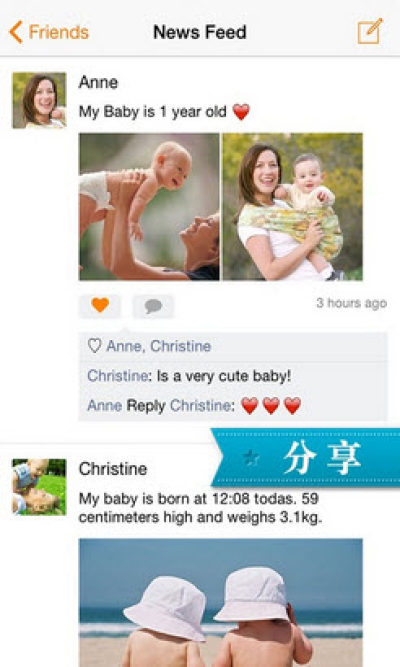 您可以邀请和添加手机通讯录中的联系人为好友,和他们分享宝宝的照片和相册,同时您也可以查看到好友分享的他们宝宝的照片和相册,当然您可以设置部分内容为隐私,只有您自己才可以看到。