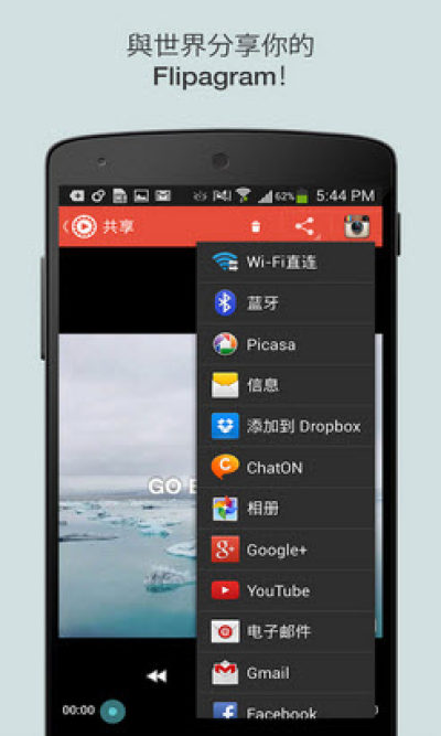 3.分享 - 在Flipagram上分享,或者在QQ空间、QQ、微信和微视等上分享。