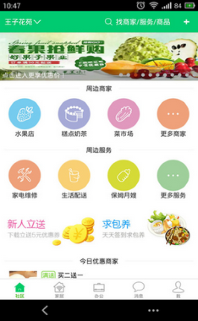 ①社区:吧乐吧APP撮合社区居民、周边商家和私家服务业者入驻,将社区居民与产品、服务实现聚合,提供便捷的本地O2O服务,辅以各种优惠。居民通过社区圈子掌握社区周边热点,和谐邻里关系。