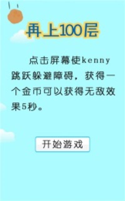 再上100层是一款休闲益智类手机游戏,游戏画面精美,操作简单,主要挑战玩家的反应能力,点击屏幕使Kenny跳跃多开障碍,若获得一枚金币则可以享受无敌效果5秒。上的层数越高,那等级也越高;若是没有跳过障碍,那Kenny受伤了,游戏也结束了。这是一款很好玩的游戏,等你来挑战。