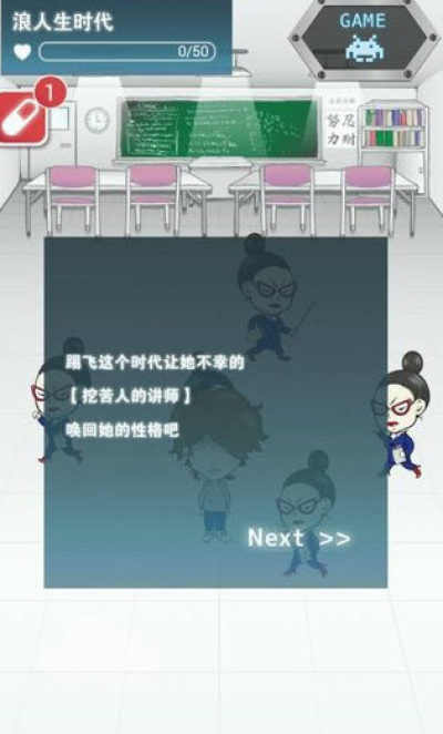 不甘于命运的作弄,我们的男主角这个时候挺身而出了,当然这个男主角就是屏幕前的你,为了恢复女友白富美的形象,你必须再次利用时光机穿梭时光回到令女朋友遭遇不幸命运的年代去改变历史的进程。首先回到车祸现场,把在场的车辆全部砸碎,这样女主角就完成了初步复活,当然这只是第一步,为了改变女朋友的命运,你还必须使用时光机穿越于女朋友的中学时代、高中时代、补习时代、大学时代和社会时代,去阻止女朋友各种不幸的事情发生。玩起来很简单,只要点击屏幕下方那颗红色的方块按钮就可以进入年代选择画面,选择完毕后可以穿越到对应的年代,进入所在的年代后只要不断的点点点场景中的人物,将其打飞完成左上角计量条的数目后就可以改变历史了。