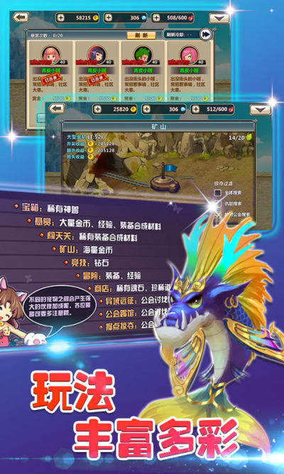 一款集合冒险打怪,竞技PK,萌宠养成,公会争霸一体的Q版卡牌手游。画面清新可爱,动感十足,酷宠博弈玩法特色有趣,大规模的公会战争热血刺激,各色各样的精彩活动令人欲罢不能。
