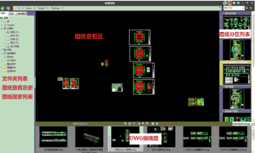 在软件的上方,为地址栏与搜索栏;左侧为系统文件夹目录、查看历史目录、图纸搜索的列表;软件的中间为图纸查看区域;右侧为图纸智能分区的缩略图;下方为选择的文件夹内,所有文件的缩略图,软件界面如下图所示: